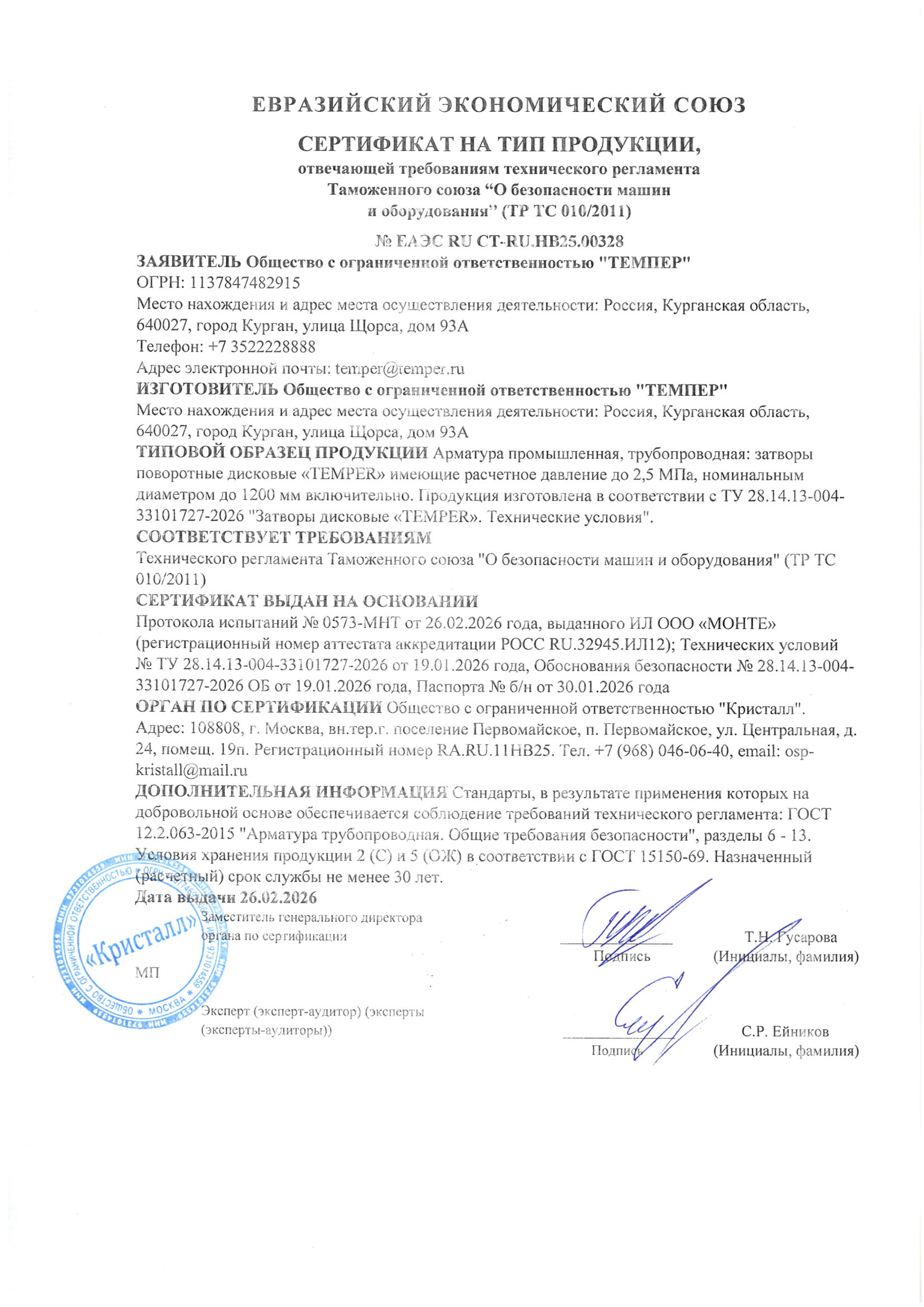 Certificate: Затвор ЕАЭС RU CT-RU